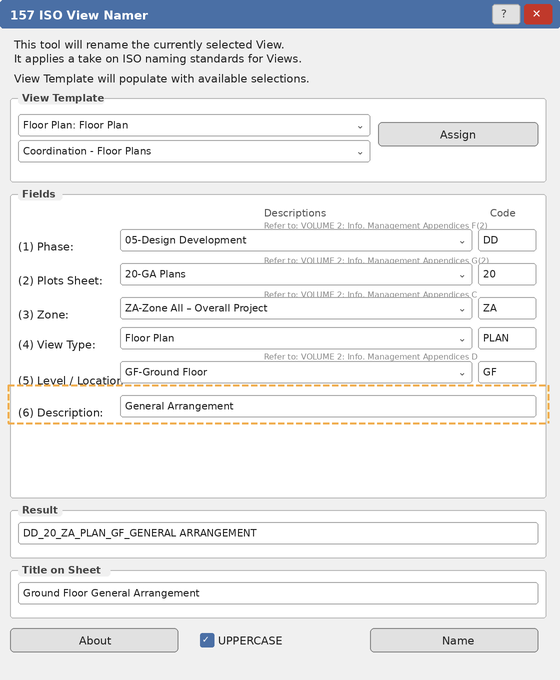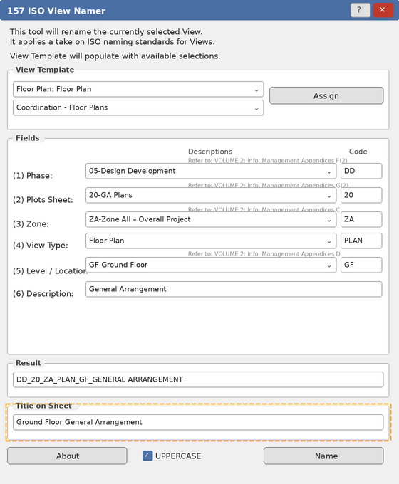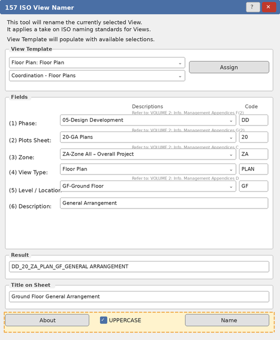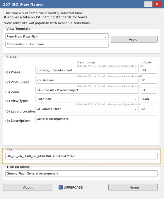 DD_20_ZA_PLAN_GF_GA→ TitleGround Floor General Arrangement. - The tool parses existing ISO names. Opening a View already named with this convention will split it by underscores and pre-fill each field — useful for correcting or updating a single component.
